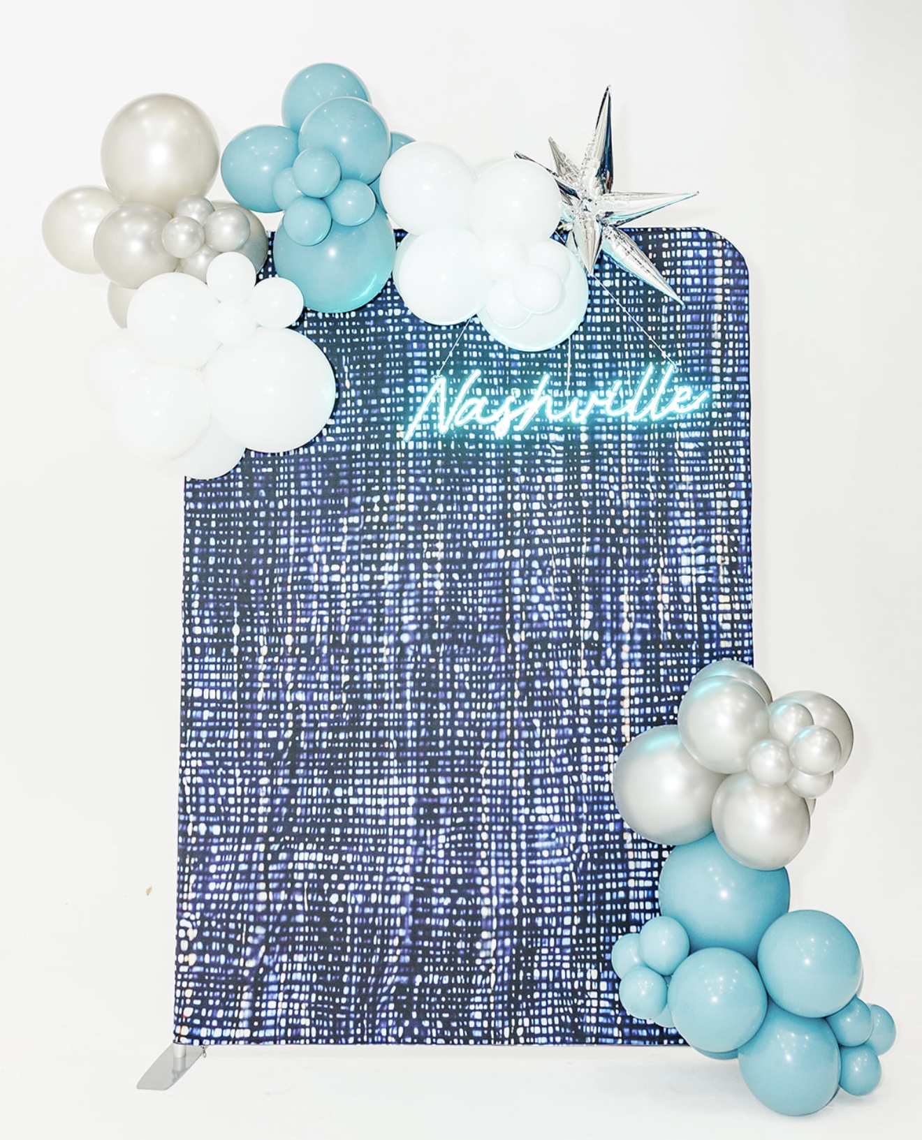 Party Wall Backdrop (blue jean) with 6 ft of balloons, 2 foils, neon happy birthday sign, 30 helium balloons Blues and greens Bootleggers 2nd floor Setup 4:30 pm Party starts at 6pm