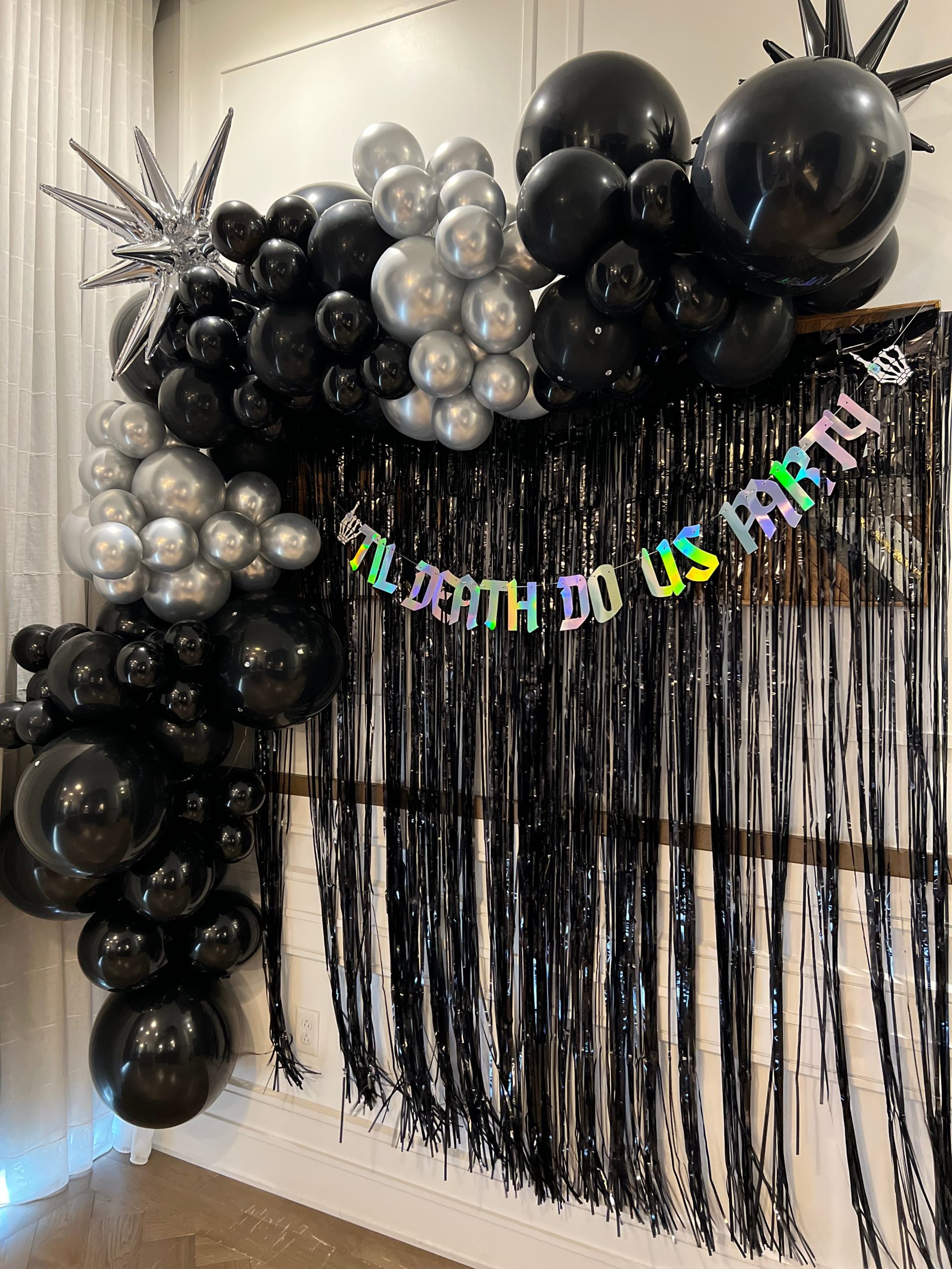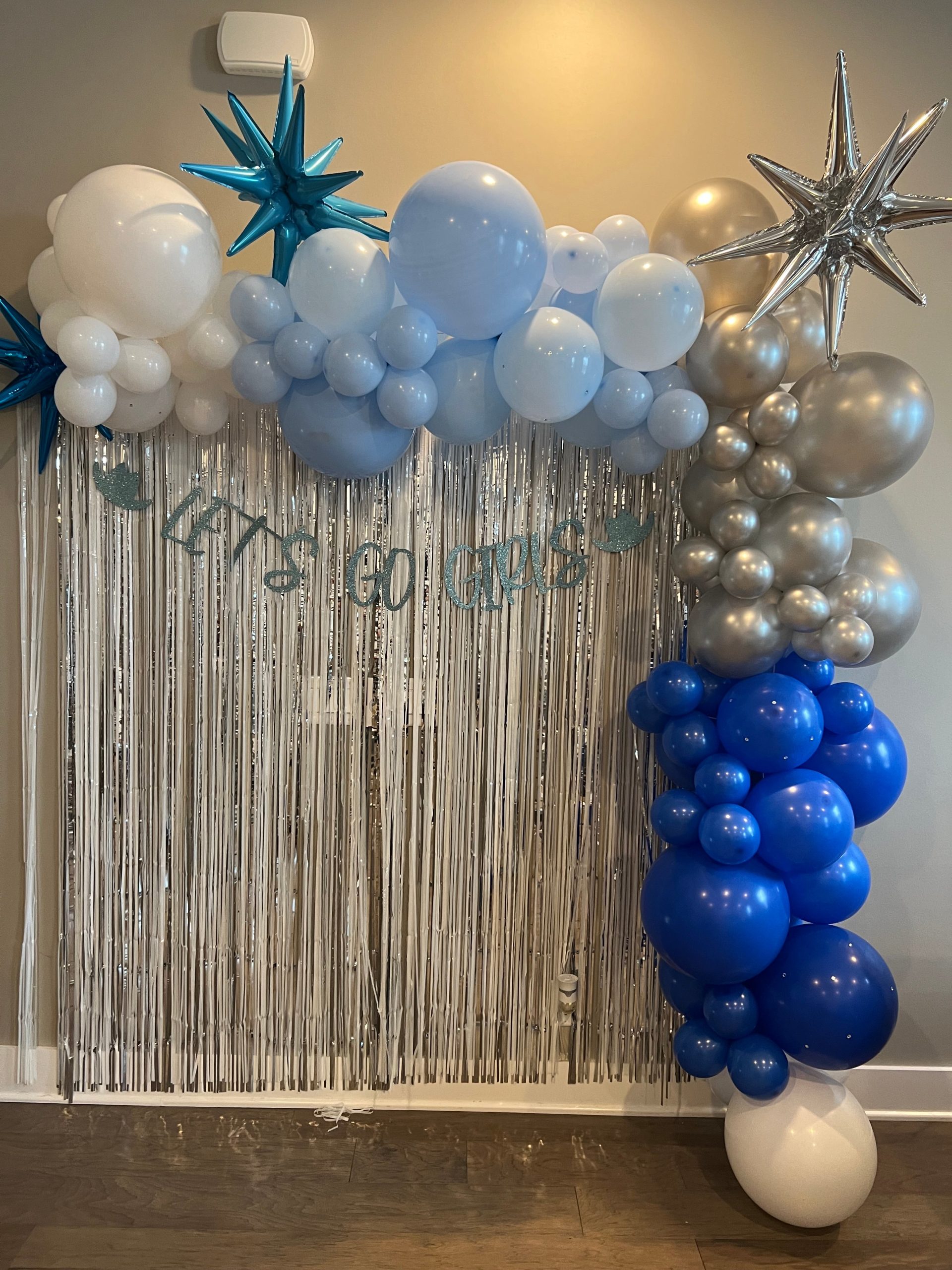 - Hanging tinsel backdrop OR accent tinsel included into balloon garlands and decor throughout the space