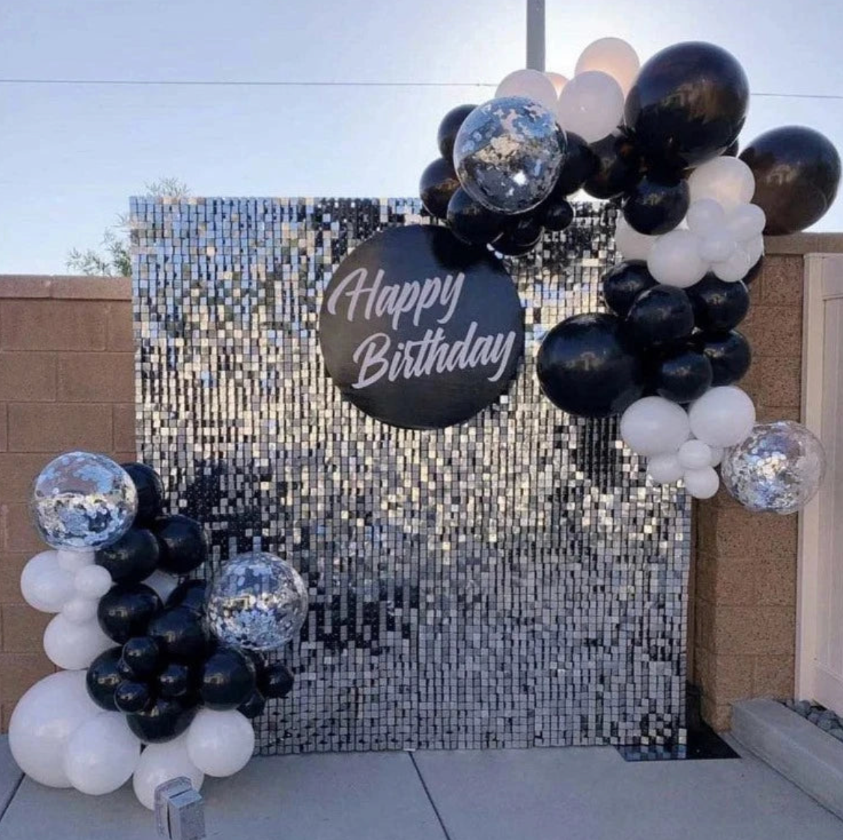 Add sparkle to your celebration with our Silver Shimmer Backdrop! This dazzling rental piece is perfect for creating a glamorous photo moment at bachelorette parties, birthdays, weddings, or any special event. Its reflective design catches the light beautifully, making your event shine with style and sophistication.